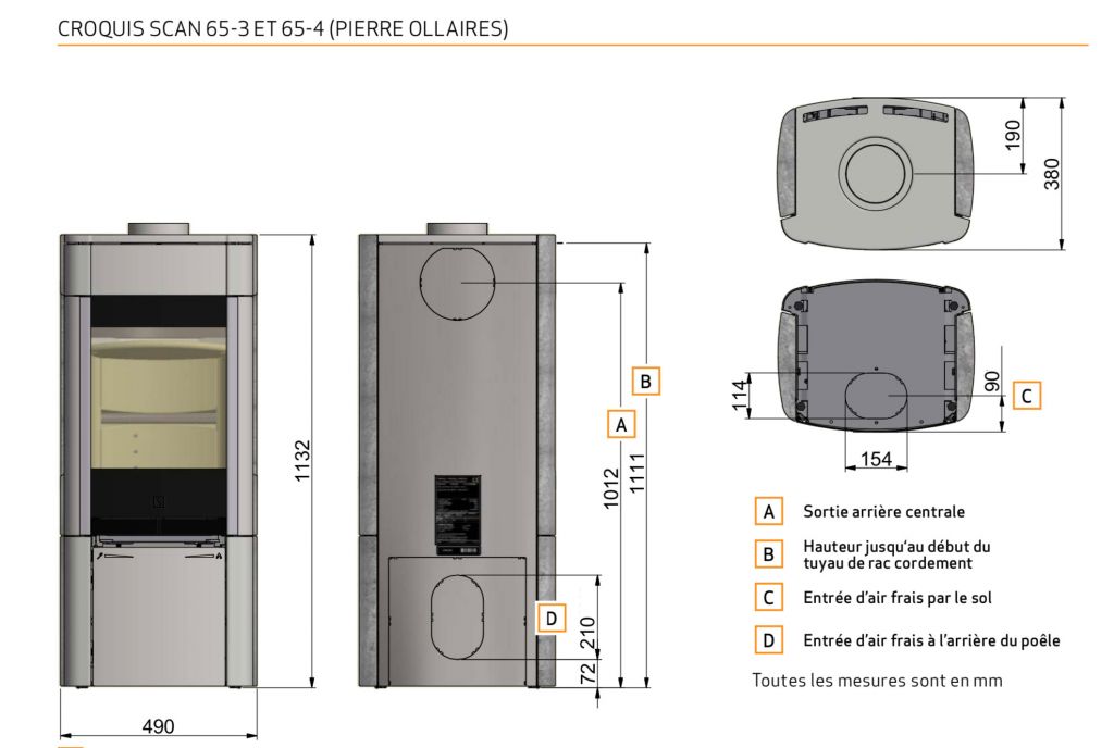 | Options | Scan 65-1 avec parements en acier noir Scan 65-3 avec parements latéraux en pierre ollaire Scan 65-3 avec parements latéraux en pierre ollaire Dessus pierre ollaire - Sortie dessus Dessus grès beige - Sortie dessus Kit d'accumulation chaleur pour Scan 65-7, Scan 67-9, Scan 65-10 Kit de raccordement pour prise d'air directe |
