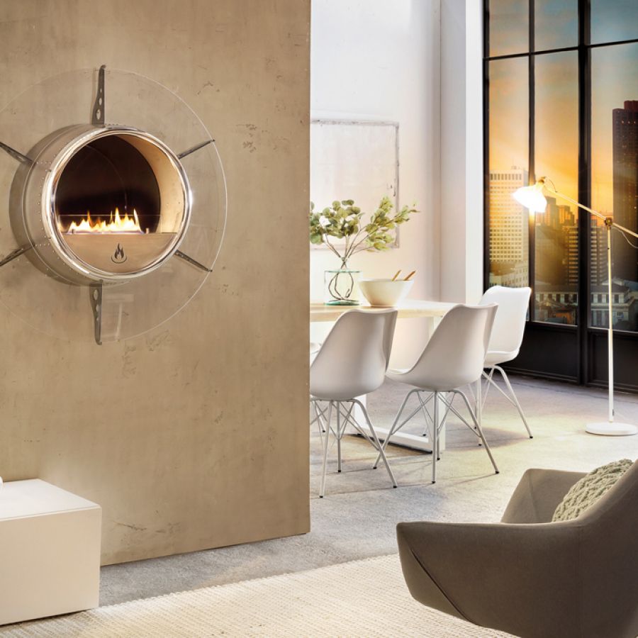 L'Aviator est un superbe insert au bioéthanol circulaire qui peut être installé sur un mur dans le salon, la cuisine, la chambre ou dans les hôtels, bureaux et tant d'autres endroits. Son design aux formes polies et effets rivetés rappelle l'âge d'or de l'aviation. Elle abrite aussi un superbe foyer qui illumine tout espace dans la maison.