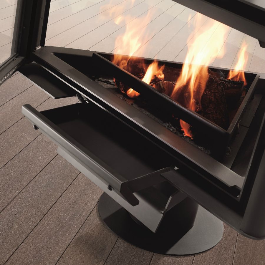 Sa silhouette épurée, soulignée par un piètement fin ou une base plus massive selon les configurations, s’intègre aussi bien dans des intérieurs contemporains que plus rustiques. Grâce à une large vitre frontale et un foyer spacieux, il offre une vue généreuse sur les flammes et une excellente diffusion de chaleur.