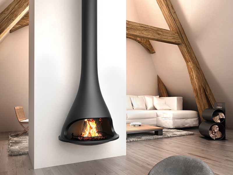 Cette magnifique cheminée suspendue existe aussi dans une version centrale et pivotante.