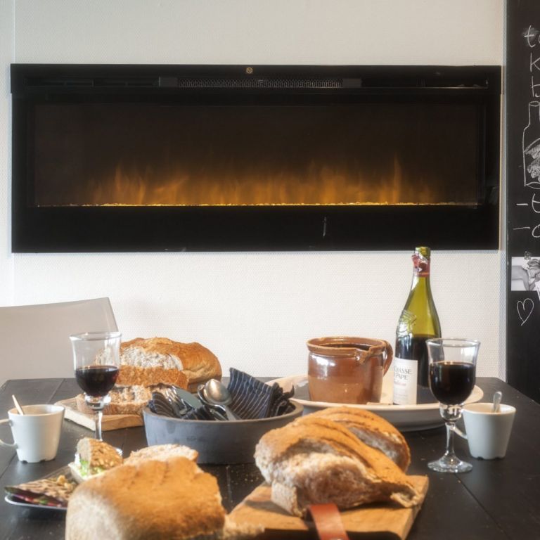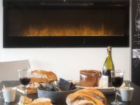 Foyer encastrable « grand écran » avec jeu de flammes réaliste. Le jeu de décoration en verre peut être remplacé par n’importe quel matériau sec avec un diamètre d’au moins de 6 mm. Cela vous permet d’adapter le foyer Dimplex à votre propre style.