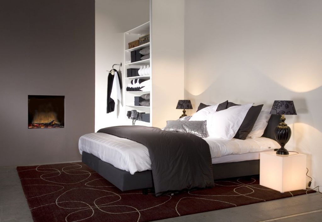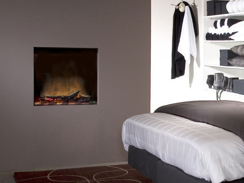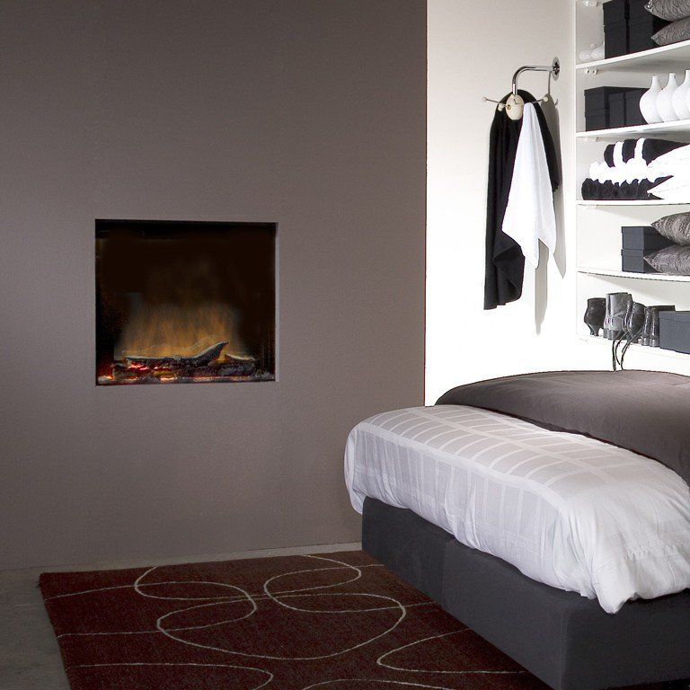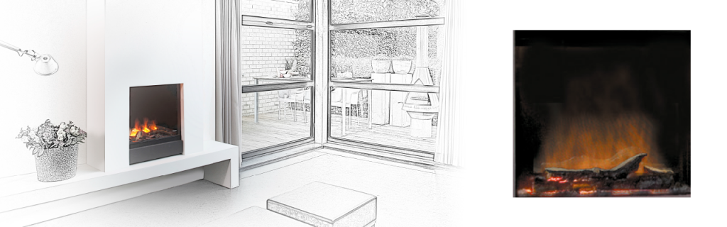 Foyer encastrable sans cadre avec jeu de flammes réaliste. Le Rana est livré avec un jeu de bûches et doté d’un éclairage LED.
